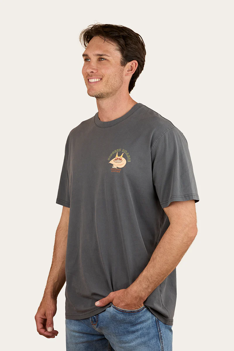 Let the good times roll in the Ringers Roadie Men’s Loose Fit T-Shirt — a soft, breathable and durable 100% cotton graphic tee made for long days, late nights and everything in between. The loose fit gives you extra room to move, making it perfect for roaming festival grounds, or kicking back with a cold one. Featuring a bold signature back graphic and a small chest print, this men’s western tee delivers effortless country style. The pre-shrunk fabric ensures reliable sizing wear after wear, while the classic crew neck makes it easy to pair with your favourite Ringers Western jeans or footy shorts.